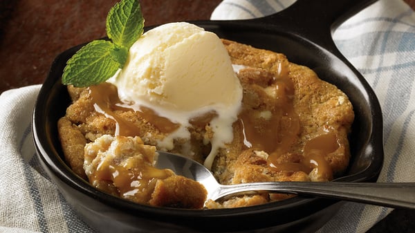 CARMEL COOKIE SKILLETLaughter ringing. Lights twinkling. Forks clinking over a warm, gooey salted caramel cookie baked fresh in a skillet, topped with rich vanilla ice cream and caramel sauce.