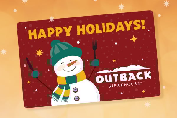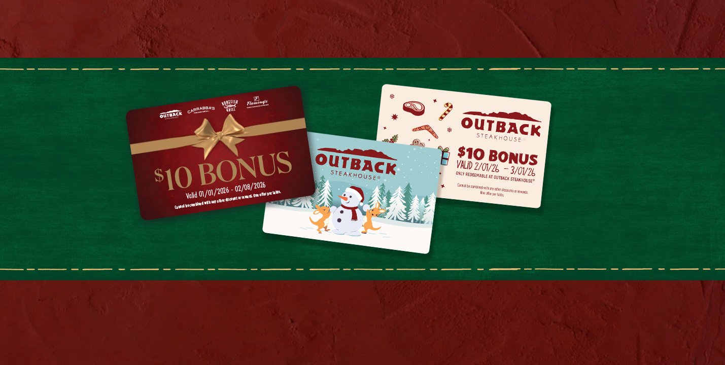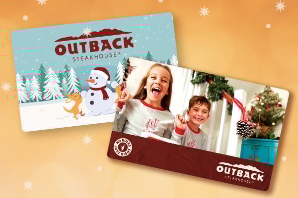 Physical Gift Cards to Fit Any HolidayOutback's physical holiday gift cards are perfect for stuffing stockings, slipping into a Christmas card, or tucking under the tree. It's the kind of gift that turns into dinner plans (and a round of cheers, mate).