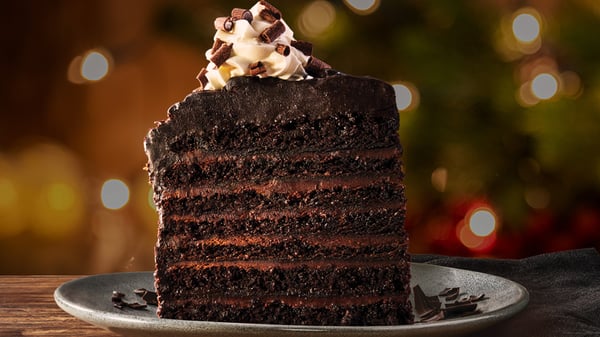 CHOCOLATE TOWER FOR TWOLaughter ringing. Lights twinkling. Forks clinking over a 6-layer tower of cocoa-rich chocolate cake trimmed with whipped cream, chocolate shavings, and raspberry sauce.
